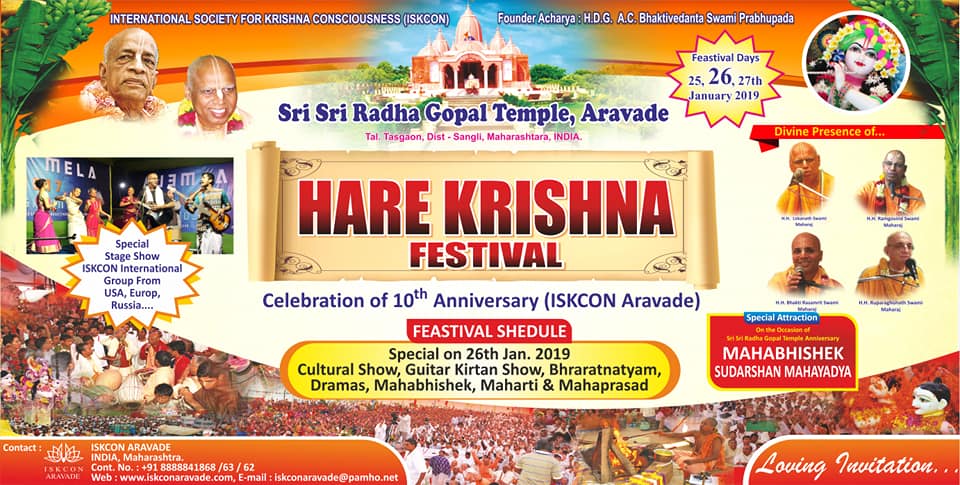 In celebration of its 10th anniversary, ISKCON Aravade is conducting a grand Hare Krishna Festival from Jan 25 - 27. On 26th, there will be a cultural show, guitar kirtan, bharatnatyam dance, drama, maha-abhishek, maha-arati, and mahaprasadam.