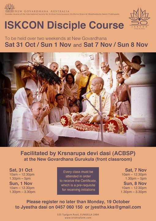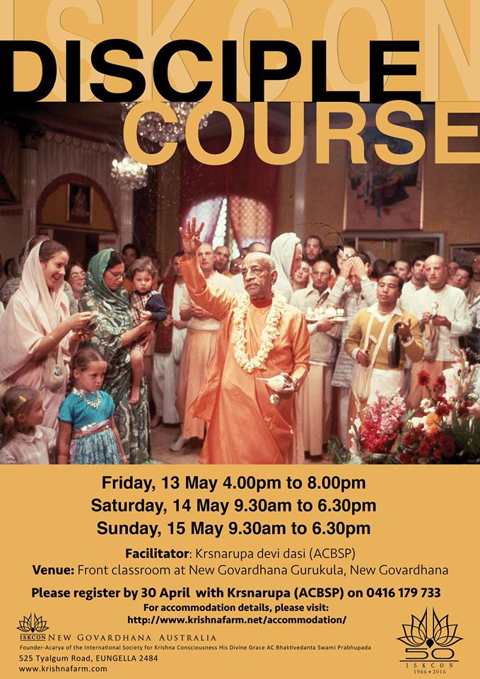 ISKCON New Govardhana Australia 525 Tyalgum Road, , EungellaThe ISKCON Disciples Course is a training program which deepens devotees understanding of guru tattva and guru padasraya within the multiple guru environment of ISKCON. Designed for new devotees preparing to take initiation in ISKCON, the course is also recommended for leaders, preachers councilors and educators in ISKCON. The course was developed under the direction […]